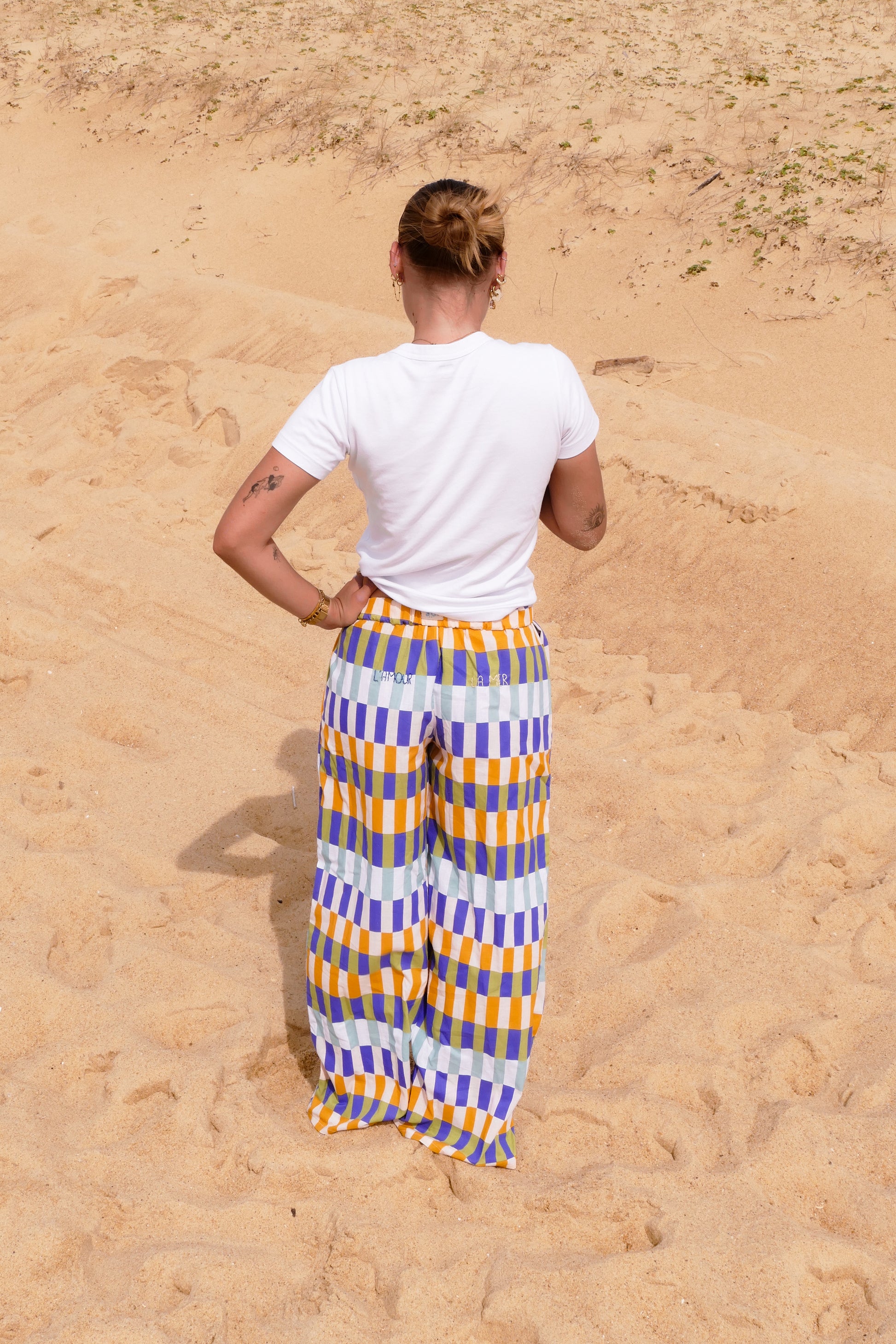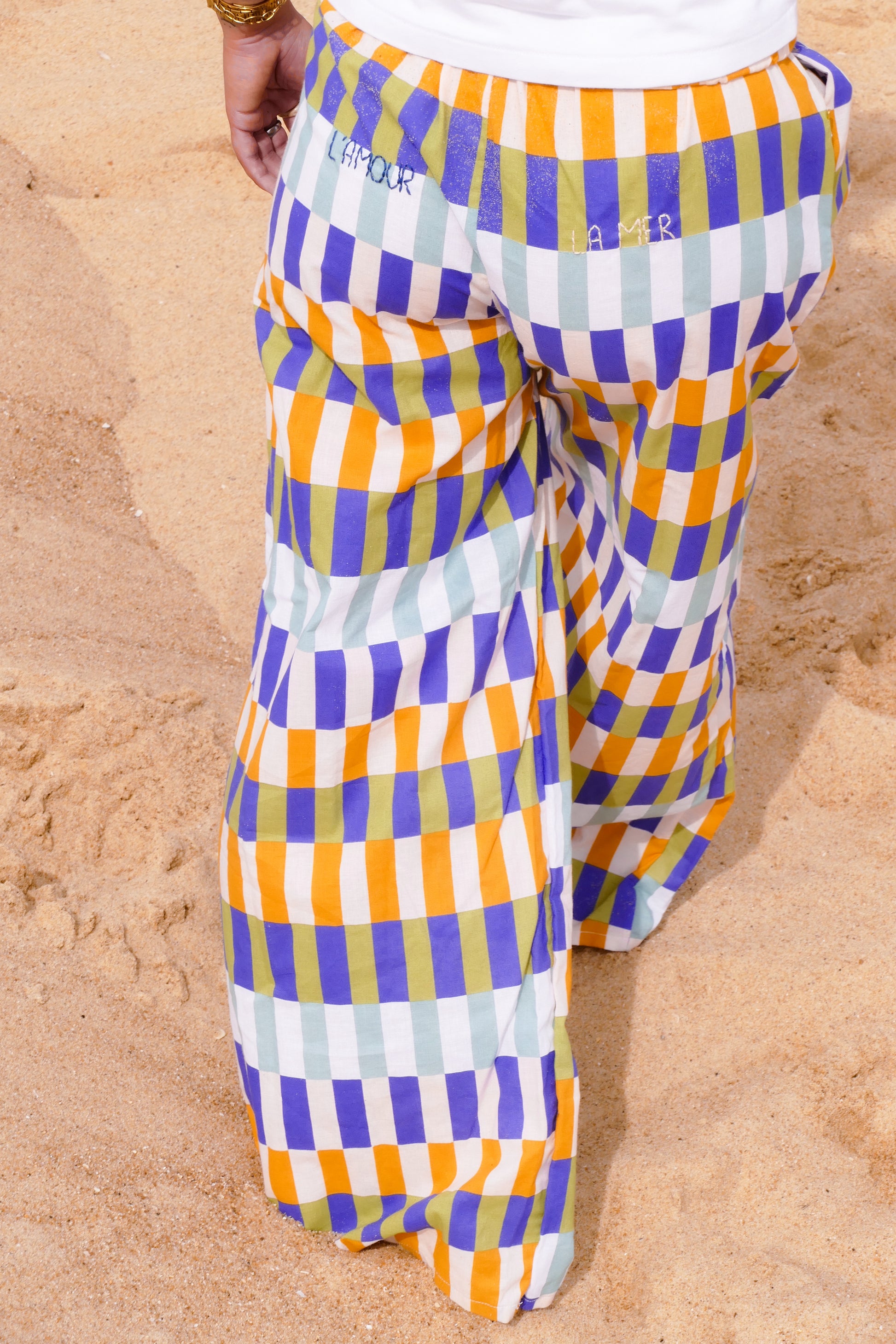 Les pantalons Nour sont entièrement cousus et brodés à la main, entre Bordeaux et Hossegor, par une seule paire de mains.